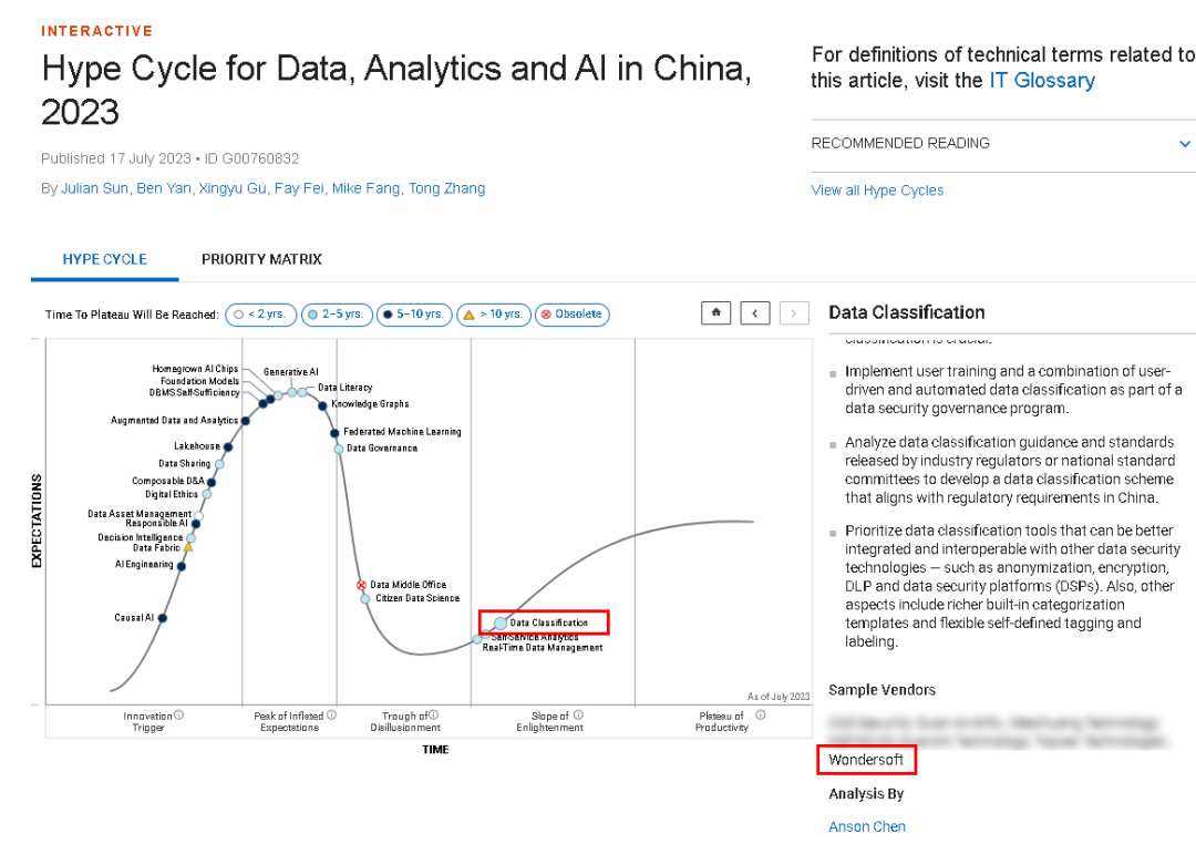 這是繼2022年明朝萬(wàn)達(dá)入選Gartner《中國(guó)數(shù)據(jù)安全廠商及重要產(chǎn)品能力推薦》、《工具:DLP廠商選擇報(bào)告(Tool: Vendor Identification for Data Loss Prevention)》之后,再一次對(duì)明朝萬(wàn)達(dá)技術(shù)能力的實(shí)力見證,也是業(yè)內(nèi)權(quán)威與中國(guó)市場(chǎng)對(duì)明朝萬(wàn)達(dá)的持續(xù)認(rèn)可。據(jù)了解,Gartner每年都會(huì)發(fā)布一版年度技術(shù)成熟度曲線,業(yè)界又稱其為技術(shù)循環(huán)曲線、光環(huán)曲線、炒作周期等,是企業(yè)用來(lái)評(píng)估新科技的可用性,利用時(shí)間軸和市場(chǎng)的炒作熱度決定要不要采用或跟進(jìn)的一種工具。此次,Gartner針對(duì)中國(guó)本土實(shí)際情況,對(duì)中國(guó)數(shù)據(jù)資產(chǎn)管理市場(chǎng)和人工智能技術(shù)的發(fā)展情況進(jìn)行了系統(tǒng)調(diào)研、分析,發(fā)布了最新的《Hype Cycle for Data, Analytics and AI in China, 2023》報(bào)告。