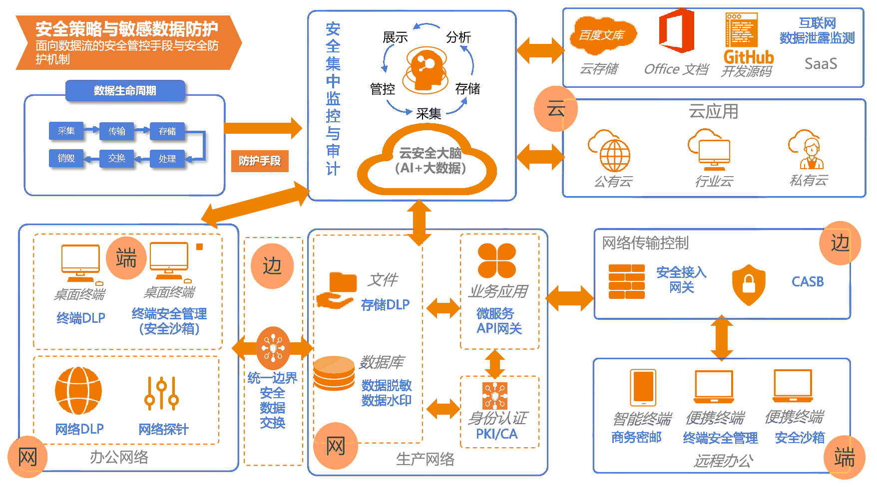 產(chǎn)品系列由安元終端DLP、網(wǎng)絡DLP、郵件DLP、存儲DLP,數(shù)據(jù)交換系統(tǒng),數(shù)據(jù)庫審計、脫敏系統(tǒng),安全接入網(wǎng)關、CASB,商務密郵(移動端),集中監(jiān)測與審計分析系統(tǒng)組成。在數(shù)據(jù)分類分級基礎上,以集中監(jiān)測與審計分析系統(tǒng)為核心,聯(lián)動端、邊、網(wǎng)、云各端子系統(tǒng)。產(chǎn)品系列通過各子系統(tǒng)產(chǎn)品提供采集、監(jiān)測和管控響應能力,由集中監(jiān)測與審計分析系統(tǒng)對行為數(shù)據(jù)進行審計和分析,通過建立數(shù)據(jù)安全行為基線,識別異常行為,對風險行為聯(lián)動子系統(tǒng)產(chǎn)品自動下發(fā)安全防護劇本,提供一站式數(shù)據(jù)安全治理方案,實現(xiàn)對數(shù)據(jù)生命周期過程中的自適應風險識別,精準防護,動態(tài)響應,防患于未然。