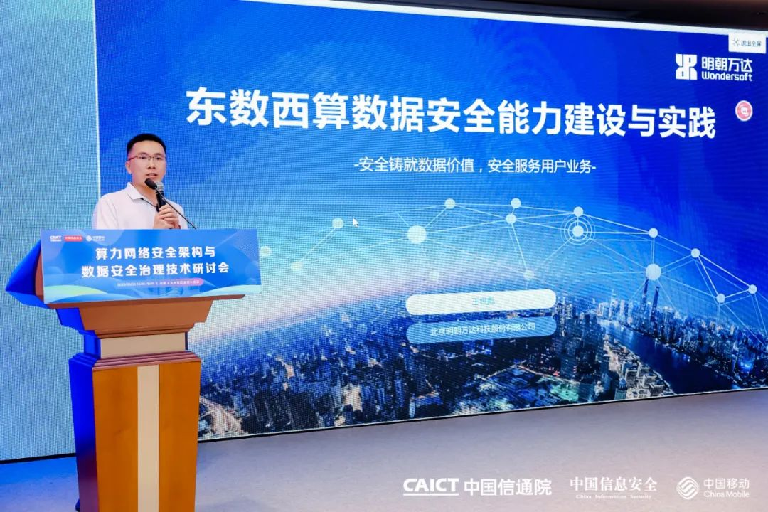9月25日,由中國(guó)信息通信研究院安全研究所、《中國(guó)信息安全》雜志社、中國(guó)移動(dòng)集團(tuán)信息安全管理與運(yùn)行中心共同主辦的“算力網(wǎng)絡(luò)安全架構(gòu)與數(shù)據(jù)安全治理技術(shù)研討會(huì)”在北京圓滿舉行。北京明朝萬(wàn)達(dá)科技股份有限公司作為協(xié)辦單位積極參與,助力會(huì)議圓滿舉行。當(dāng)天,公司政企事業(yè)部技術(shù)負(fù)責(zé)人出席會(huì)議并發(fā)表《東數(shù)西算數(shù)據(jù)安全能力建設(shè)與實(shí)踐》主題演講。