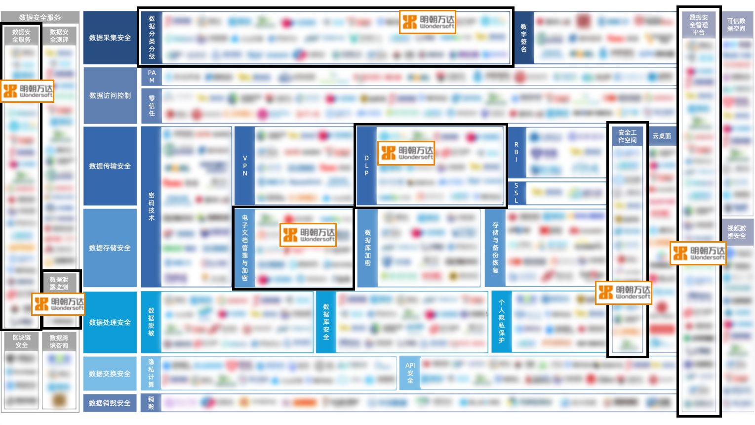 該報(bào)告中的數(shù)據(jù)安全市場(chǎng)全景圖,作為數(shù)據(jù)安全領(lǐng)域的重要參考,涵蓋了數(shù)據(jù)安全市場(chǎng)的各個(gè)領(lǐng)域與關(guān)鍵環(huán)節(jié)。全景圖的評(píng)選標(biāo)準(zhǔn)極為嚴(yán)格,不僅要求廠商具備領(lǐng)先的技術(shù)創(chuàng)新能力與深厚的行業(yè)積累,還需在市場(chǎng)占有率、客戶口碑、品牌影響力等方面表現(xiàn)出色。明朝萬(wàn)達(dá)憑借過(guò)硬的技術(shù)實(shí)力和突出的市場(chǎng)表現(xiàn),上榜數(shù)據(jù)安全服務(wù)、數(shù)據(jù)泄露檢測(cè)、數(shù)據(jù)分類分級(jí)、安全工作空間、DLP、電子文檔管理與加密、數(shù)據(jù)安全管理平臺(tái)7項(xiàng)領(lǐng)域代表廠商。