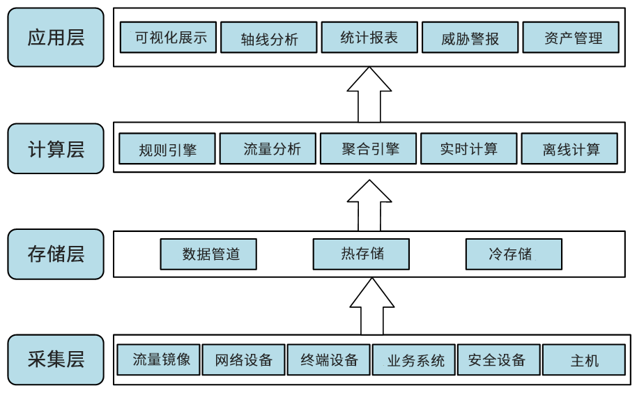 SIEM主要是由采集層,存儲層,計算層,輸出層四部分組成。采集層主要用來采集所有網(wǎng)絡(luò)安全信息源,并對數(shù)據(jù)集進(jìn)行簡單處理,轉(zhuǎn)化為統(tǒng)一的格式,便于存儲。存儲層主要功能是存儲采集的原始數(shù)據(jù)和計算分析完成的結(jié)果,并為后續(xù)的分析與可視化展示提供數(shù)據(jù)支撐。計算層,是SIEM中最為重要的一層,包括規(guī)則匹配計算,算法計算,流量分析計算等多種計算分析模型。輸出層主要是將計算層分析的結(jié)果進(jìn)行多種輸出方式實現(xiàn)可視化展示。
