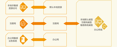 ? ? ? 基于對項目整體需求的理解和梳理,綜合運用沙盒技術(shù)、虛擬盤技術(shù),同時結(jié)合身份認證、準入管控、網(wǎng)絡(luò)隔離等技術(shù),為辦公終端構(gòu)建了本地默認桌面、互聯(lián)網(wǎng)桌面、辦公網(wǎng)敏感系統(tǒng)桌面等三個桌面,分別適用于本地非敏感資源的訪問、互聯(lián)網(wǎng)資源訪問、辦公網(wǎng)核心業(yè)務(wù)系統(tǒng)訪問等三大典型應(yīng)用場景,各個桌面可獨立應(yīng)用、自由切換,為中信銀行辦公終端整體構(gòu)建了安全易用的辦公環(huán)境。主要實施內(nèi)容如下: