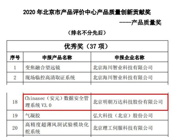 近日,由北京市產(chǎn)品評價中心主辦的“2020年產(chǎn)品質(zhì)量創(chuàng)新貢獻(xiàn)獎”評選結(jié)束,并正式公布“產(chǎn)品質(zhì)量創(chuàng)新成果表彰名單”。其中,明朝萬達(dá)北京科技股份有限公司(明朝萬達(dá))憑借自主研發(fā)創(chuàng)新產(chǎn)品“Chinasec(安元)數(shù)據(jù)安全管理系統(tǒng)V3.0”榮獲“產(chǎn)品質(zhì)量優(yōu)秀獎”。