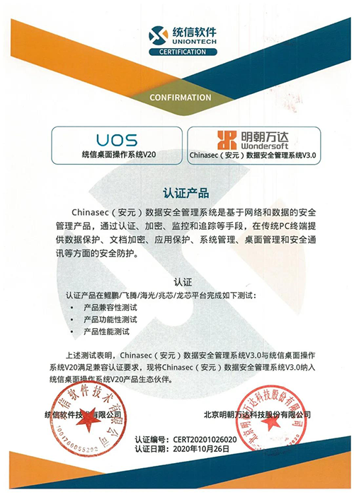 明朝萬(wàn)達(dá)Chinasec(安元)數(shù)據(jù)安全系列產(chǎn)品相繼完成了與UOS統(tǒng)一操作系統(tǒng)的產(chǎn)品兼容性互認(rèn)證測(cè)試,適配基于飛騰和鯤鵬(ARM)、龍芯(MIPS)、兆芯和海光(x86)五個(gè)國(guó)產(chǎn)CPU的平臺(tái)環(huán)境。以及完成了與銀河麒麟高級(jí)服務(wù)器操作系統(tǒng)(龍芯版)的兼容適配。