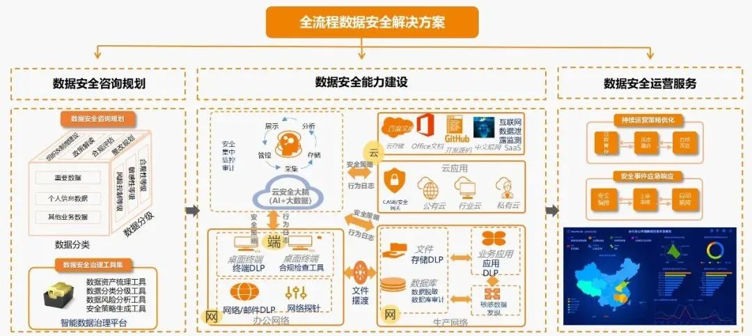 數(shù)據(jù)安全防護(hù)體系建設(shè)可以劃分出三個(gè)方向。其中,數(shù)據(jù)安全咨詢規(guī)劃主要幫助企業(yè)解決數(shù)據(jù)資產(chǎn)梳理、數(shù)據(jù)分類分級(jí)、安全風(fēng)險(xiǎn)評(píng)估、安全策略生成;數(shù)據(jù)安全能力建設(shè)是以數(shù)據(jù)分級(jí)分類為基礎(chǔ),構(gòu)建敏感數(shù)據(jù)發(fā)現(xiàn)、流轉(zhuǎn)監(jiān)測(cè)、外發(fā)管控和審計(jì)溯源的解決方案,通過云安全大腦(AI+大數(shù)據(jù)),進(jìn)行數(shù)據(jù)安全可視化建設(shè),實(shí)現(xiàn)對(duì)辦公數(shù)據(jù)、生產(chǎn)數(shù)據(jù)、運(yùn)維數(shù)據(jù)等的安全管控,滿足金融機(jī)構(gòu)敏感數(shù)據(jù)合規(guī)性要求,有效降低數(shù)據(jù)泄密風(fēng)險(xiǎn);數(shù)據(jù)安全運(yùn)營(yíng)服務(wù)則是為了實(shí)現(xiàn)常態(tài)化、持久化的安全運(yùn)營(yíng)。