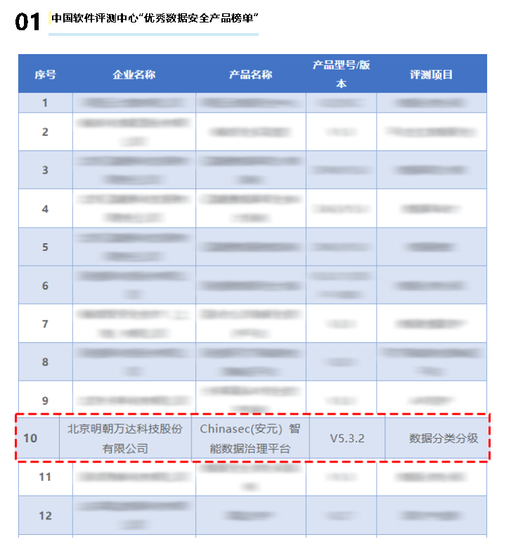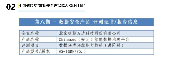 近日,明朝萬達“Chinasec(安元)智能數據治理平臺”先后通過中國軟件評測中心數據安全產品檢測及中國信通院數據安全產品能力驗證,成功入選優(yōu)秀數據安全產品榜單,榮獲評測證書。