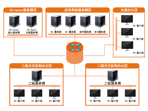 - 2臺二級服務(wù)器部署在北京中心二級分中心,負責分公司辦公終端管理;