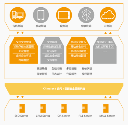 ? ? ? Chinasec(安元)數據安全管理系統(tǒng),以“防內為主、內外兼防”為理念,通過認證、加密、監(jiān)控、追蹤等手段,對傳統(tǒng) PC 終端和移動終端提供文檔加密、身份認證、安全接入、應用保護、訪問控制等全方位的安全防護。