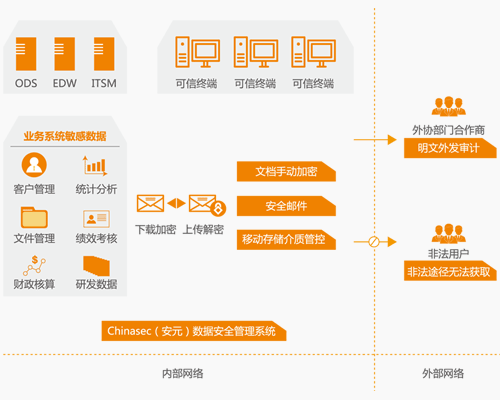 ? ? ? 采用 Chinasec(安元)數據安全管理系統(tǒng),提供數據全生命周期防護解決方案,員工從業(yè)務系統(tǒng)下載的敏感文檔在企業(yè)內部以密文的形式流轉,終端邊界管控策略則保證了非法途徑無法獲取、無法解密敏感文檔。