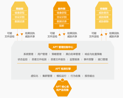 - 傳播的途徑主要包括郵件、網(wǎng)絡(luò)入口、電腦終端,該系統(tǒng)可以分別部署在網(wǎng)絡(luò)側(cè)、郵件側(cè)及終端側(cè),對(duì)進(jìn)入公司內(nèi)部網(wǎng)絡(luò)的可疑文件進(jìn)行檢測(cè),對(duì)終端下載文件、U 盤文件、郵件附件進(jìn)行檢測(cè),并詳細(xì)記錄其傳播途徑。當(dāng)檢測(cè)到相應(yīng)的威脅時(shí),可以直接通過(guò)部署在終端的 APT 組件進(jìn)行威脅查找、威脅隔離、威脅刪除等處理操作,完成對(duì) APT 攻擊的檢測(cè)及防御處理。