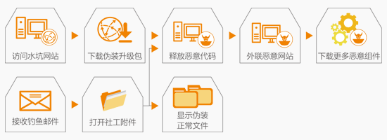 - 如圖所示“魚叉”及“水坑”的攻擊過(guò)程,除了惡意程序投入方式不同,其攻擊的過(guò)程都是通過(guò)引誘攻擊目標(biāo)下載并打開相應(yīng)的惡意文件,釋放惡意代碼來(lái)完成攻擊過(guò)程。